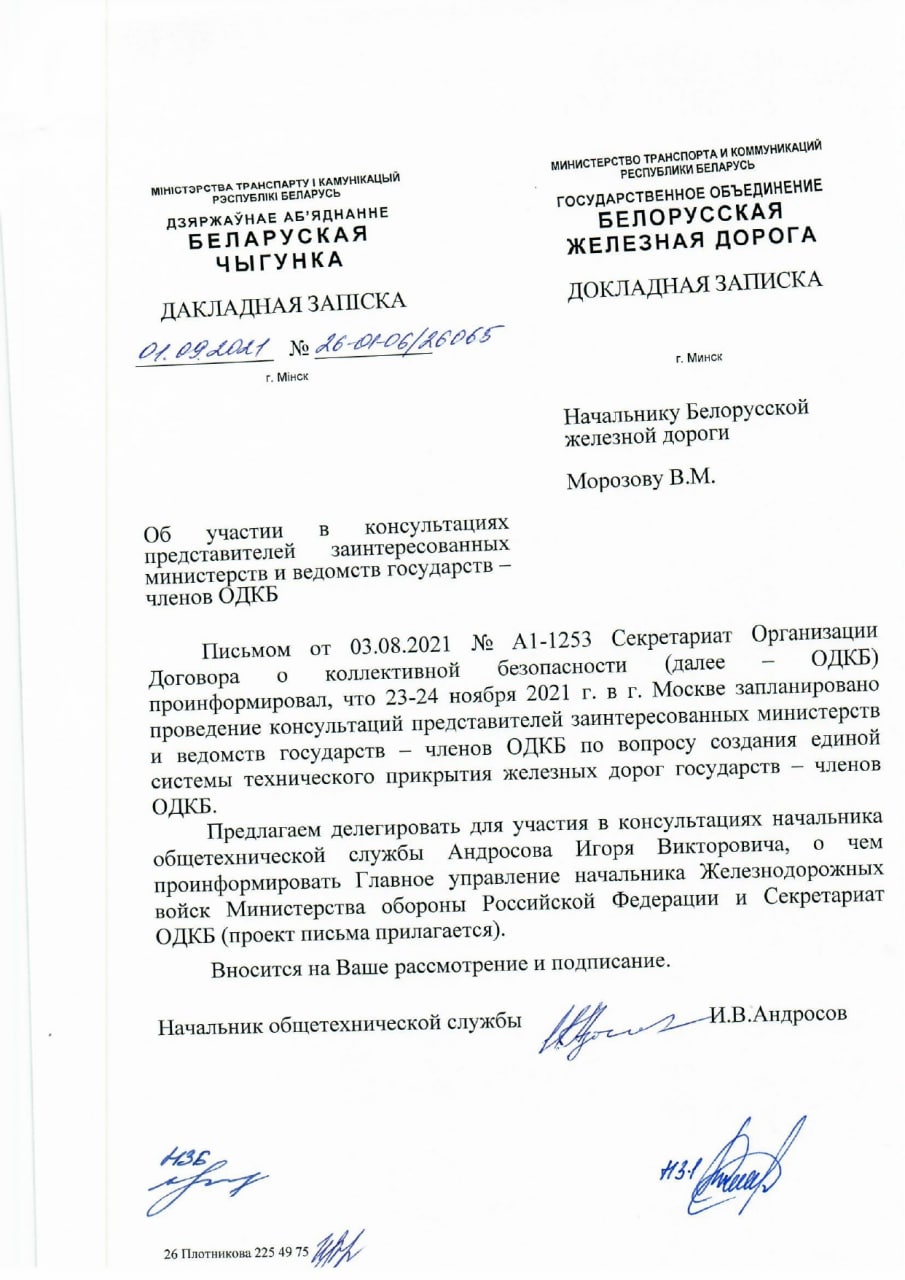 Сегодня и завтра в Москве состоится проведение консультаций представителей заинтересованных министерств и ведомств государств — членов ОДКБ по вопросу создания единой системы технического прикрытия железных дорог государств — членов ОДКБ.