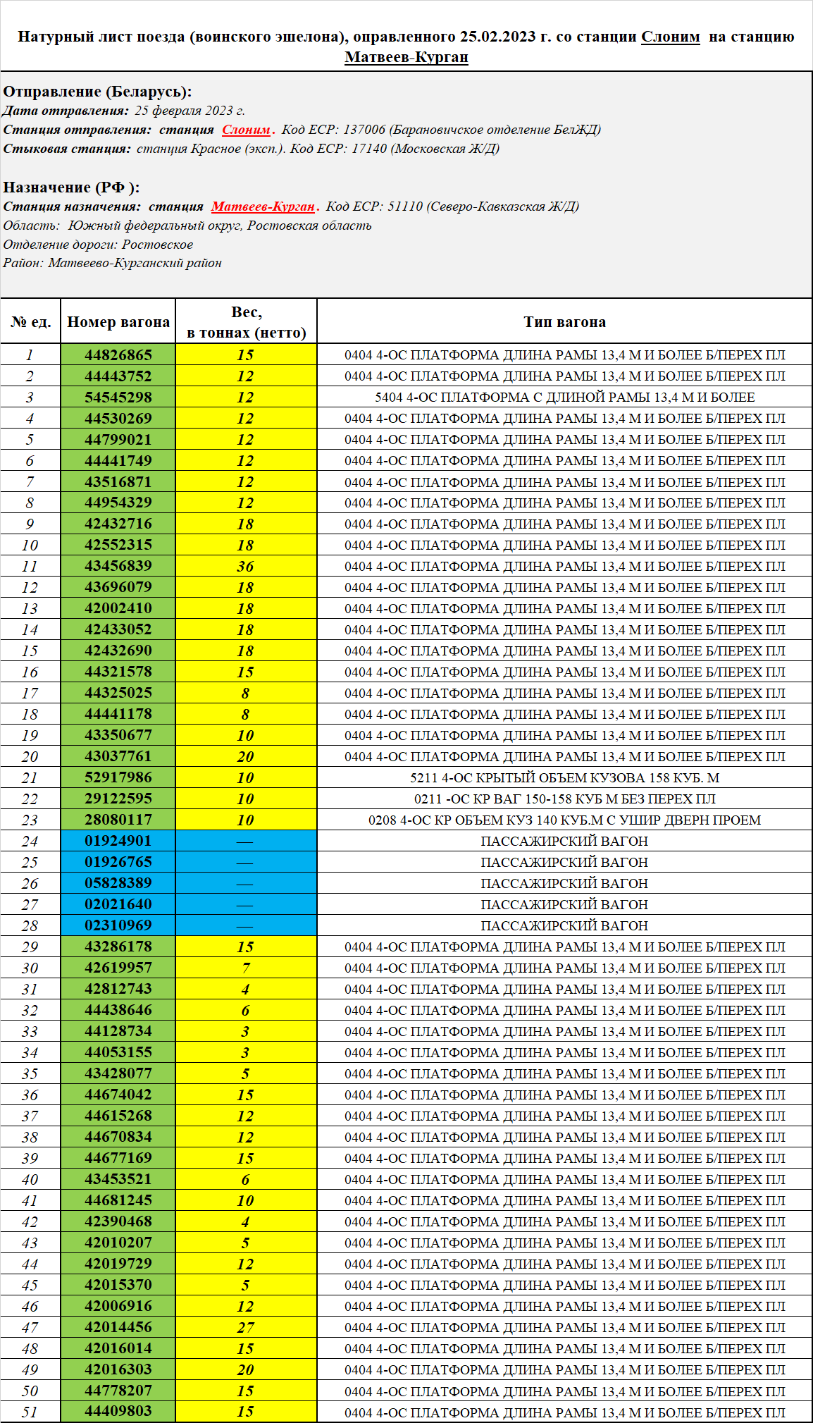 25.02.2023 года со станции Слоним (Барановичское отделение БЖД) на станцию Матвеев-Курган (Северо-Кавказская Ж/Д) был отправлен воинский эшелон №962, в составе которого находился 51 вагон, из них: