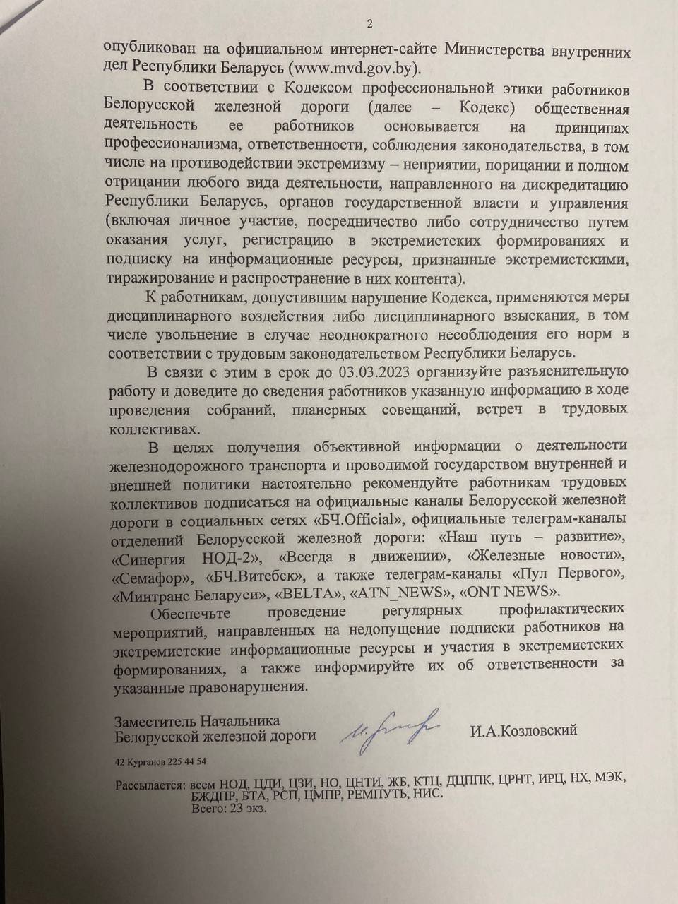 Не обошлось в этом опусе без упоминания «пресловутого» Кодекса профессиональной этики работников Белорусской железной дороги — ещё одного рычага воздействия на железнодорожников, ещё больше ущемляющего их в правах, одновременно дающего больше возможностей руководству для реализации репрессивных мероприятий.