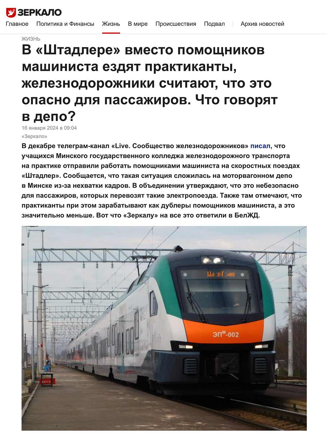 Хорошо это можно описать на «свеженьком» пусть мелком, но характерном примере одной из новостей 17.01.2024 с телеграм-канала БЖД «О профессии — с гордостью!». Где машинист локомотивного депо Брест Константин Хромых сообщает, что «…на работу всегда идет в хорошем расположении духа. На магистрали он трудится 25 лет и признается, что жизни без любимого дела не представляет». И фото счастливца на фоне электропоезда «Штадлер». Идиллия! Только вот локомотивные бригады депо Брест подвижной состава данной серии не обслуживают, а соответственно, и никакого отношения к современному и красивому «Штадлеру» К.Хромых не имеет. Как известно, «дьявол скрывается в мелочах»…
